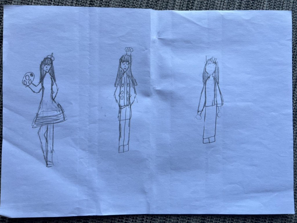 美玲是三崙國小的一名學生,自去年十月在與同學遊戲時意外骨折後,她便在家中長期休養,直到四月仍透過線上方式參與課堂活動。訪談的一開始,我們邀請美玲畫出三種她未來會想要從事的三種職業,她不急不躁地花了將近四十分鐘,用一筆一筆慢慢勾勒出她的三個夢想角色:美髮師、畫家、設計師。問了她為什麼是這三種職業,美玲表示:「美髮師,是因為媽媽啊,也覺得很好玩。」而畫家則是出於對畫畫的純粹喜愛。她常常畫爸爸媽媽,也會自己上網找圖練習人物畫。設計師也是因為家裡有人從事相關職業。