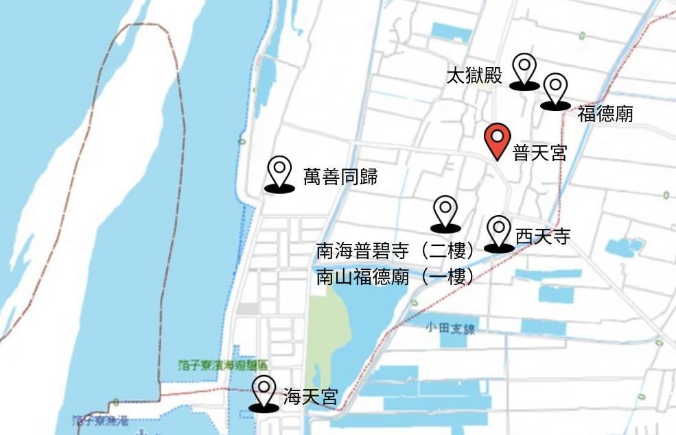 普天宮除了主祀神溫府千歲外,陪祀神在當地的地位也十分重要。同時,在溫府千歲的指示下從普天宮內遷出的許多神明也具有鎮守地方等重要功能,諸如太嶽廟的地藏王、海天宮的水仙尊王與南北福德廟。不同神明各司其職,滿足了萡子寮居民的生活需求。除了前述提到在夜巡會四處「衝」,為居民淨宅的金府千歲外,太嶽廟的地藏王負責當地祭改與超渡亡者的儀式、南北福德廟將村落包圍以保佑村落、海天宮的水仙尊王保佑當地的漁業安全與繁榮。其中關於水仙尊王如何從普天宮分出以庇佑當地漁業的故事在蔡瑞泉總幹事的描繪下顯得十分活潑生動: