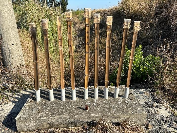 除了夜巡的路線所蘊含的轄區範圍外,五營兵馬的社會功能、宗教象徵意義以及其隱含的漢人「中心-四方」的地方觀在林瑋嬪(2020)被十分完整地闡述。因此在田野工作剛開始的前幾天,我們在老師的建議下,也總是穿越在各種小徑中尋找外五營的蹤跡。不幸的是,我們尋找許久、詢問當地村民也仍未發現五營的影子。直到某一天,我們於路旁發現了一組以金紙與紅布包裹著尾段的竹枝,上面寫著普天宮眾神尊的名號(圖四)。在詢問普天宮蔡瑞泉總幹事後,才得知其為當地的鎮符。