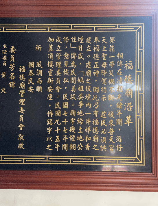 初到萡子寮之時,普天宮蔡瑞泉總幹事為讓筆者更了解萡子寮當地的宮廟與信仰,於一日午後騎上自行車,帶著我們自普天宮往建陽國小的方向出發,一路依序經過以地藏王為主祀神的「太嶽殿」、北邊的土地公廟「福德廟」、以彌勒佛主為祀神的「西天寺」、南邊的土地公廟「南山福德廟」、以觀音菩薩為主祀神的「南海普碧寺」、以水仙尊王為主祀神的「海天宮」,以及萬善同歸等廟宇,這些廟宇四散在萡子村、萡東村中,圍繞著萡子寮社區(圖一)。總幹事表示,萡子寮社區信仰多神,而眾多廟宇當中,有部分是由普天宮的神明指示建廟,例如從福德廟中的沿革中便可了解其建廟歷史(圖二):