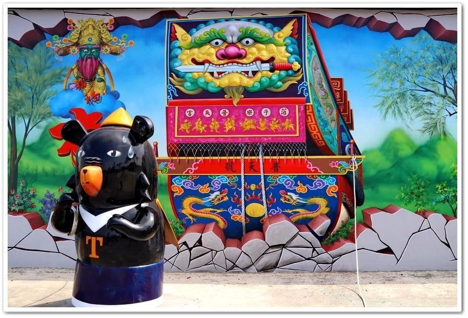 到田野的第一日,蔡執行長在當天下午三點多時,帶著我們走進萡子寮的巷弄之中,認識社區環境。整個萡子寮其實隨處皆可見到社區營造的痕跡,其中以「喔熊藝術村」的壁畫與設施貫穿整個村落。如下圖這幅壁畫以當初漁民將溫府千歲漂來時乘坐的王船拉上岸的故事為主題,將「喔熊」比做把「普天號」拉上岸的漁民,結合藝術與信仰(圖十)。同時,在畫面左上角畫著注視著一切的Q版溫府千歲,除了展現社區營造者對宣揚普天宮與溫府千歲故事的渴望,也再次強調了「神與人」共同作用的概念。
