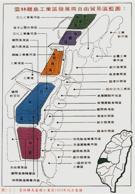 再生能源並不是四湖鄉第一次經歷的國家發展論述,1990年,經濟部工業局在雲林沿海四鄉規劃「雲林沿海離島式基礎工業區」,計畫在麥寮、台西、四湖、新興四個區域以填海造陸的方式建造面積約一萬七千兩百多公頃的土地,由濁水溪南岸向南延伸三十二公里,東西距離三至四公里。如此巨大規模的開發計畫震撼了雲林沿海地區,當時許多媒體報導大幅宣傳、口號四起,宣稱能創造上萬就業機會(劉曜華 2006:199)。然而,除了約兩千兩百公頃的麥寮六輕廠在1998年開始營運以外,其餘的區域皆取消開發,至今仍基本上沒有建設和廠商進駐,整個工程花費了約一百億,如今只是空蕩蕩的陸地,偶爾有釣客驅車前往岸邊釣魚。