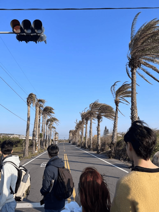 這件事被我們特別記得。不同於第一天直衝而來的強風,那天早上是個晴朗的好天氣,我們三人當下並沒有特別注意到風。與此同時,和我們在同一時空下的大哥卻理所當然地指出風的方位;並指出東北季風對路燈設施的影響。