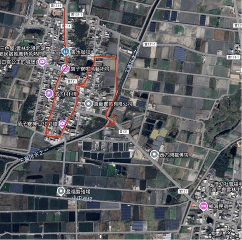 Google衛星地圖存檔了過去一年內萡子寮的最新街景,我們將地圖放大,按下街景小人,被記錄過的路此時都浮現出藍色記號。無論在地球的哪一個地方,都能夠立即觀看,同時,我們亦可調閱不同時間街景車拍攝的畫面,回顧近十多年的風景差異。附圖是我們即將瀏覽的路線,就讓我們從萡子寮和廣溝之間的雲131大路開始。