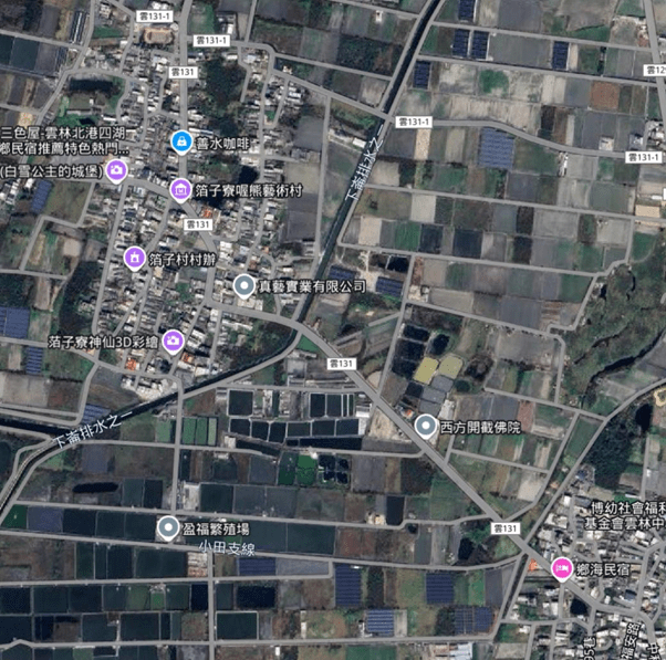 我們開啟衛星地圖,按住游標向南移動,尋找到雲林虎尾之後,再向西搜尋,看見棋盤一般密密麻麻的道路和水渠,跨過台61線快速道路,來到了這裡。田園之間出現了叢集的村落,一條分岔路悄悄繞進村內,這將會是我們的田野地——萡子寮。
