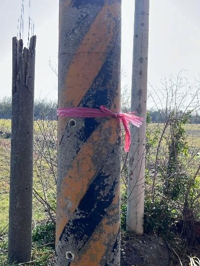 來到田野第二天,我們正好遇上每兩週一次的路燈維修檢查。每天晚上村長在巡邏的時候,都會注意村內各處路燈的運作情況是否良好,如果有路燈應該亮起卻故障,村長就會將它記錄下來並觀望一陣子。待他判斷這座路燈的確需要修理,就會在燈桿或附近電線桿上綁起紅色塑膠線段,使維修人員來到村裡時能快速辨認哪盞路燈需要維修(見圖十)。
