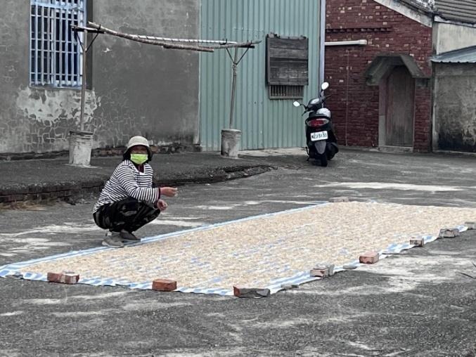 我們最後停在一處拐個彎就可以抵達春天民宿的岔路口,一旁有塊水泥空地,上頭鋪著一塊塑膠布,邊緣用磚頭壓住,布上攤著一層厚厚的番薯籤。那是游阿姨放在那邊曬的,雖然是別人家的地方,但彼此互相認識,這樣曬沒問題。