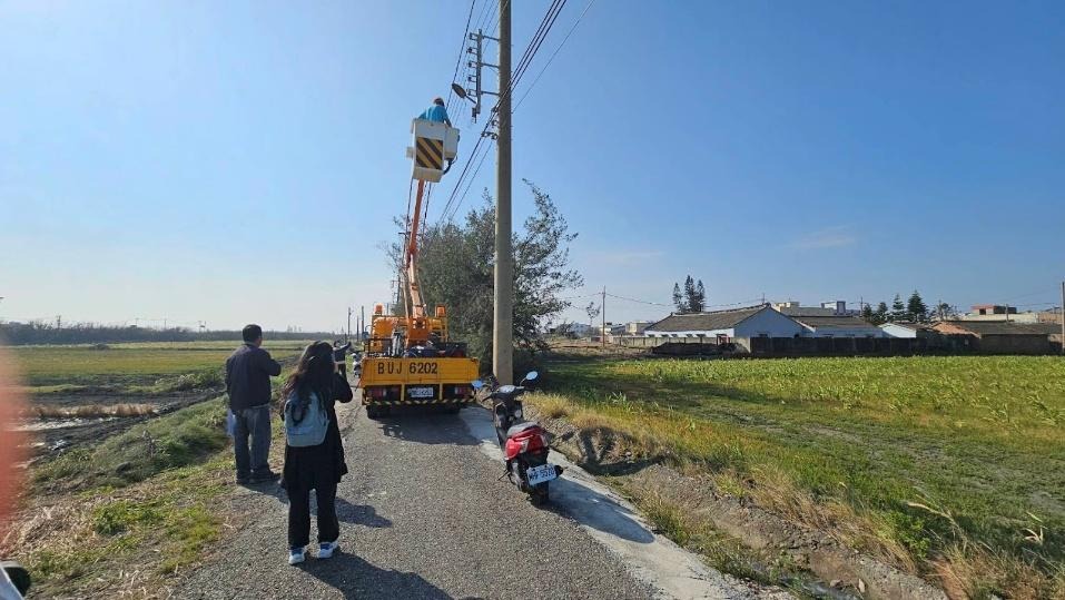 當天早上,我們騎著機車跟隨巡視。工人站在高度及胸的白色桶狀載臺,操縱機械手臂升至可徒手觸碰燈罩的高度,然後他打開裝有安定器的鐵箱檢查,確認後俐落地將燈罩掀開,若需要替換燈泡,就從載臺內取出工具進行。整套流程非常快速,不到五分鐘就能修理好一座路燈。這個時候司機會和工人分工,司機紀錄地址或門牌號碼、填寫維修表格。流程走完以後就往下一座路燈前進。司機告訴我們,四湖鄉全境共有二十一村,都是由鄉公所負責路燈的修繕。修繕時主要確認的有三點:燈泡、安定器(變電仔)與燈座。大哥緩慢地補充,這裡通常不會有什麼難處理的狀況,該有的工具維修車上都有。