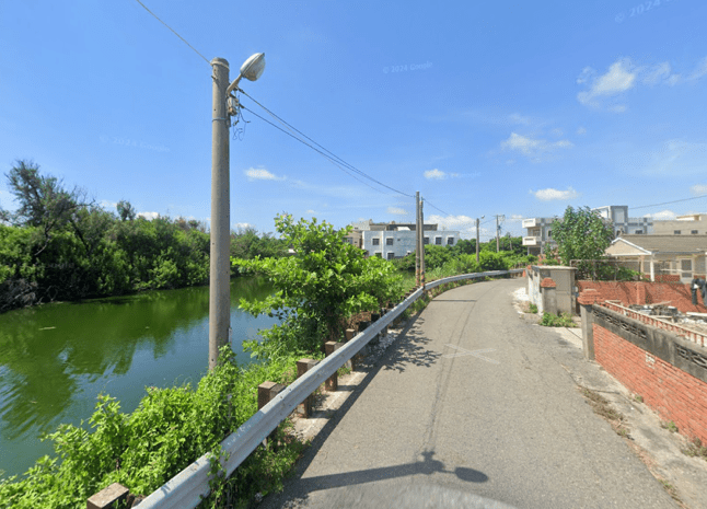 但我們必須回頭,我們從大路回到普天宮前,並留意這條道路是萡子寮內「東村」及「西村」的分界線。是時候前往東村看看了,還未到達普天宮之前,電線牽連在東邊靠房屋的那一側,西面則又是一片灰土田園。拐彎處有棟白瓷磚、絢麗的鏤空陽台別墅,側邊出其不意地展開一條龜裂、褪色的碎柏油小徑,不仔細注意必然會錯過。這條路的盡頭,景象卻煥然一新,在紅磚三合院背面,竟是氣派的獨棟透天厝。這些寧靜的民宅環繞著一座沉靜低調的大湖,沿湖闢建的鄉村路使用了和台灣中高海拔山路同款的道路欄杆,一時有種時空錯置的感覺(圖六)。
